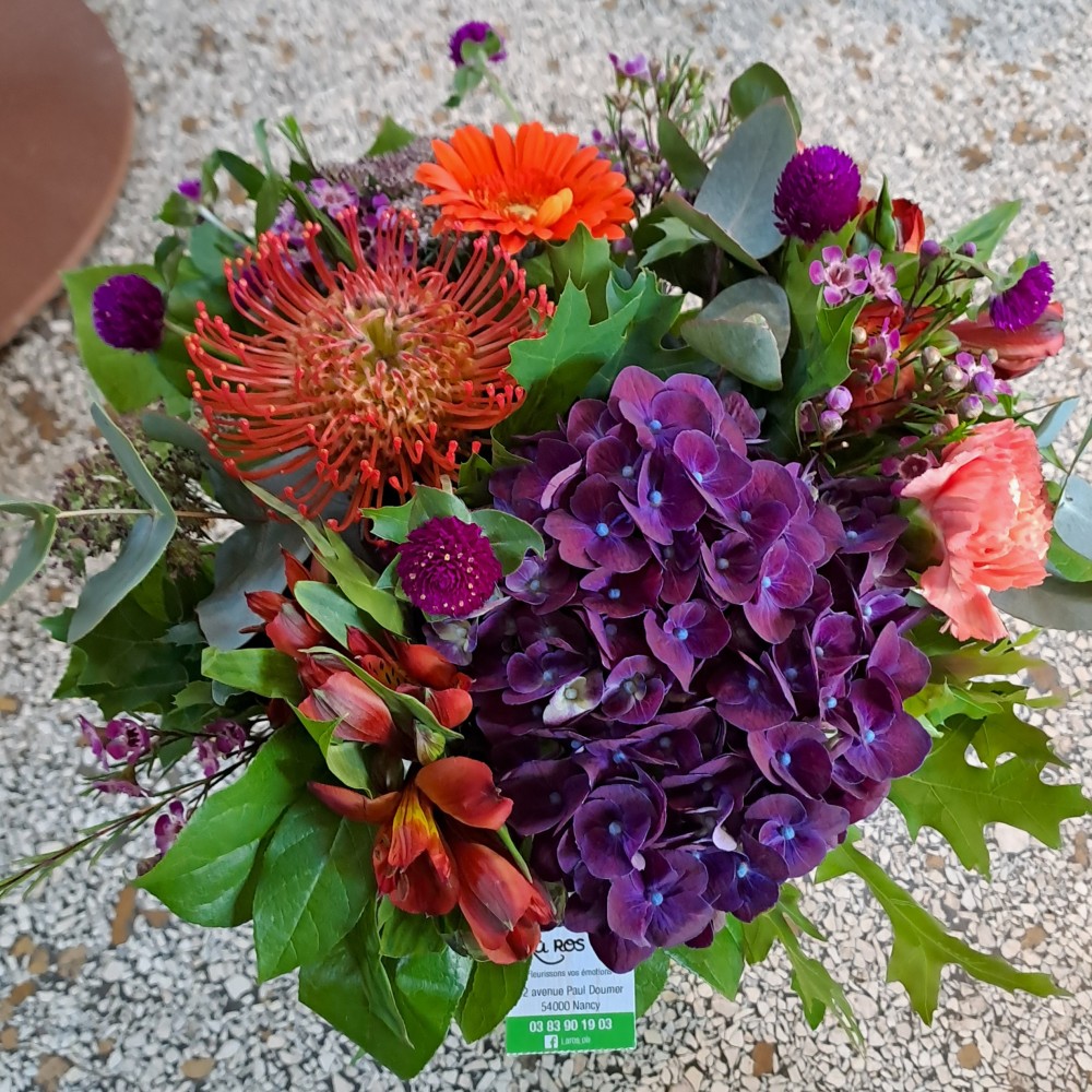 Un bouquet qui joue les contrastes avec panache : cassis profond et orange flamboyant, comme un duo amoureux qui se taquine autant qu’il s’adore. C’est l’automne version passion, entre feuille qui rougit et soleil qui s’attarde. Un vrai coup de cœur pour réchauffer les journées qui raccourcissent… et mettre un peu de feu dans le salon !